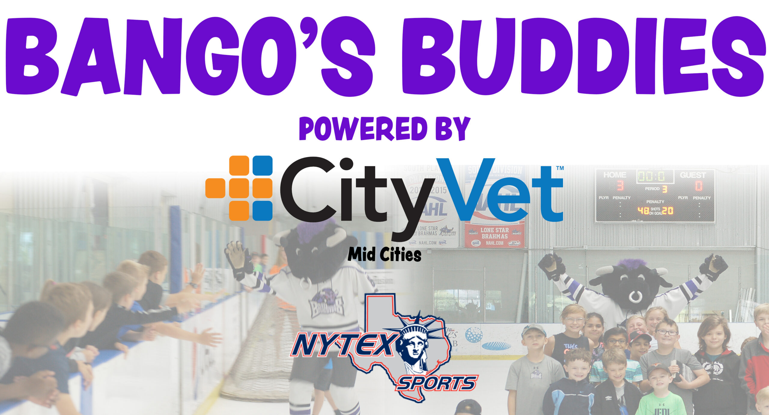 NORTH RICHLAND HILLS, TX – The Lone Star Brahmas are excited to announce a new program here in Brahma Land! Bango’s Buddies is a new partnership between the world’s greatest mascot, Bango, the Brahmas, and City Vet Mid Cities.